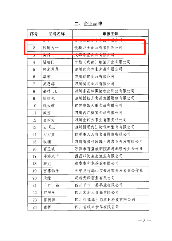 根据《“天府粮仓”农业品牌建设行动方案》和《四川省农业品牌目录制度》的要求,省农业农村厅近日公布了第三批四川省农业品牌目录入选名单,该名单涵盖全省80个品牌,其中“铁骑力士”企业品牌成功入选。