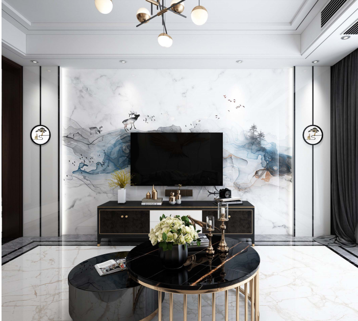 刘董告诉记者,他自己做这个行业已经有20多年,冠睿最早开始是做石材罗马柱背景墙、渗墨产品、高温定制背景墙、UV工艺产品等系列产品,现在主推陶瓷大板和岩板。